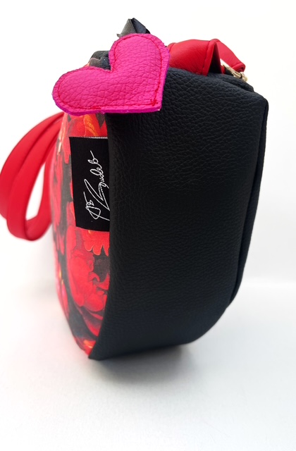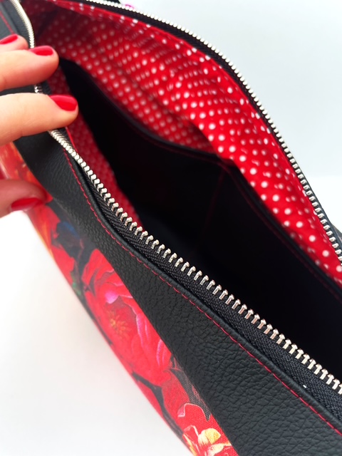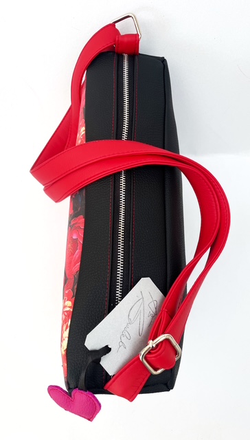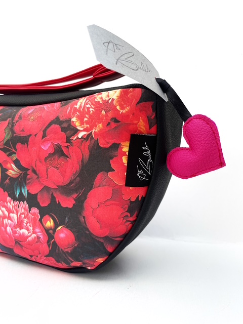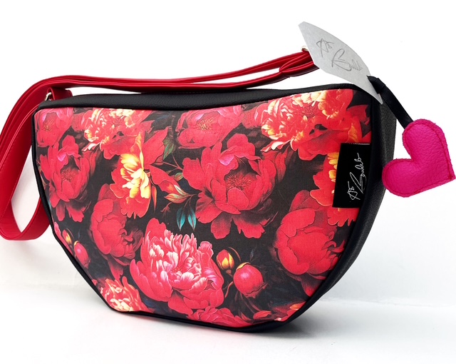 Gyönyörű & elegáns, az első különleges, vörös pünkösdirózsa minta, a kedvenc bestseller SLICE Deluxe Crossbody oldaltáskán.Belül 2 zsebbel / állítható piros pántokkal és pöttyös béléssel
